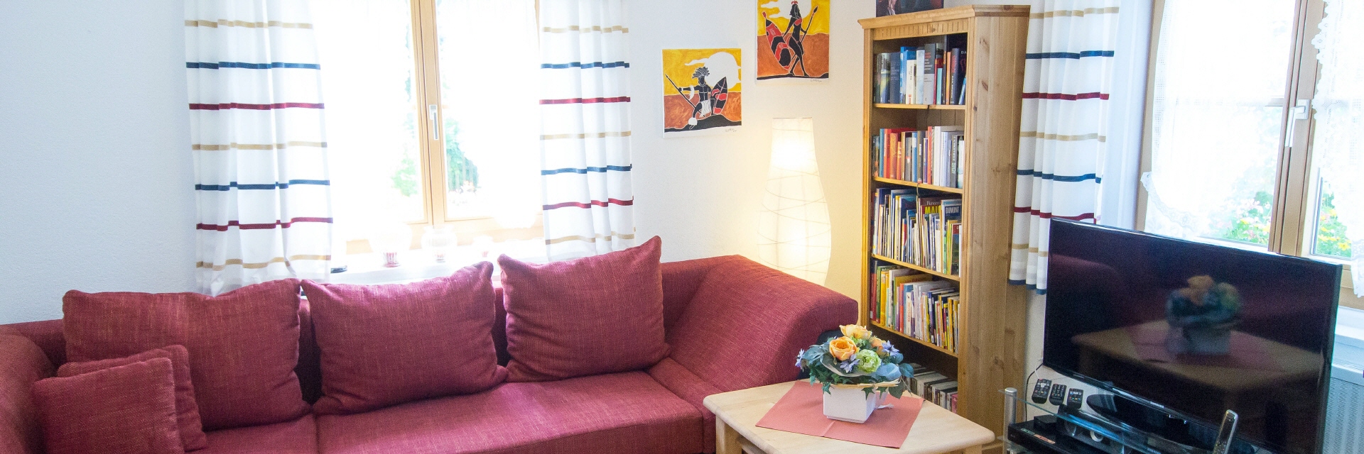 Unsere Ferienwohnung im Erdgeschoss ist ideal für zwei Personen; sie kann aber auch mit bis zu drei Personen belegt werden. In diesem Fall wird aus dem Wohnzimmer ein weiteres Schlafzimmer. So können wir auch kleine Familien unterbringen.