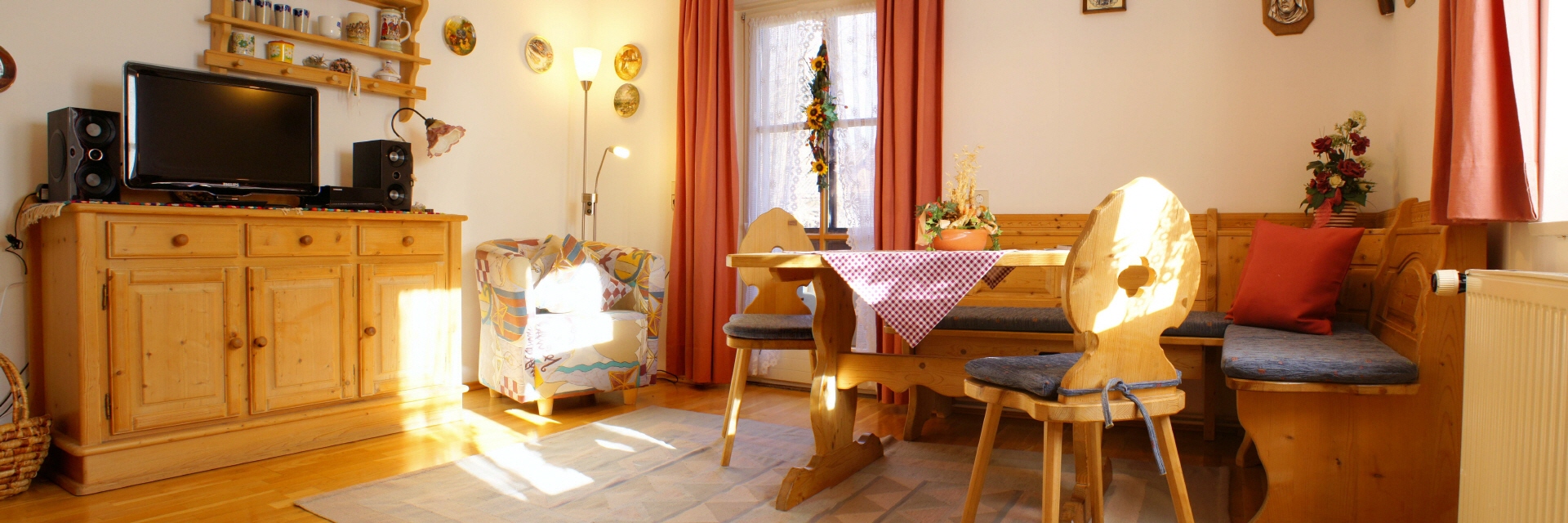 Jede Ferienwohnung hat eine gemütliche Wohnküche mit vollwertiger Ausstattung und einer Einbauküche, ein Schlafzimmer mit Vollholzmöbeln, ein Bad sowie ein einladendes Wohnzimmer. Ein großer, verglaster Balkon nach Osten zeichnet die Ferienwohnung im Obergeschoss aus.